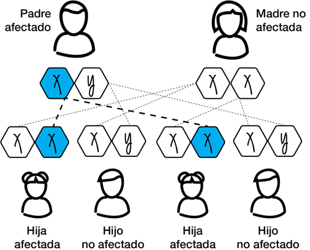 Los hombres tiene un cromosoma X y un cromosoma Y. Los hijos varones recibirán el cromosoma Y, y las hijas heredarán el cromosoma X
