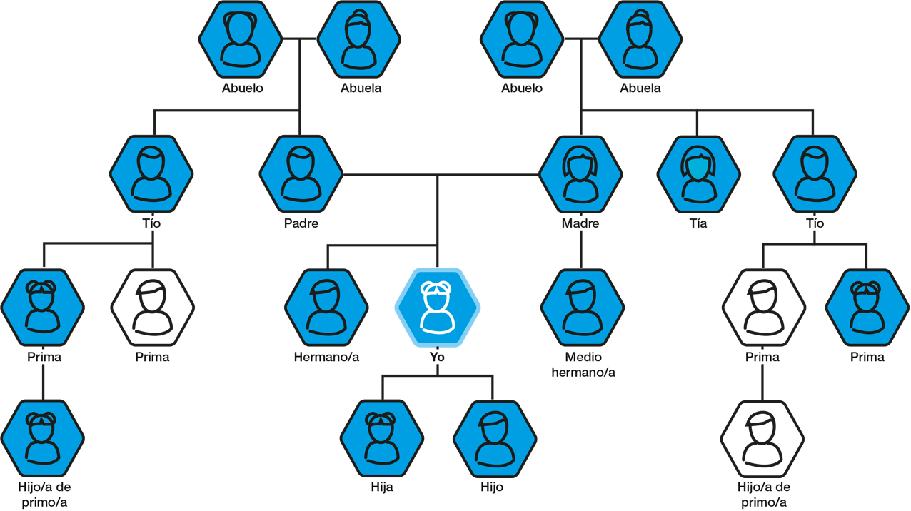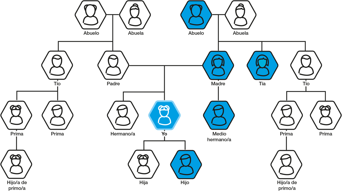 Las personas resaltadas en azul podrían tener la mutación responsable de la Enfermedad de Fabry pero, en realidad, es poco probable que todas la tengan. La Enfermedad de Fabry es rara y solamente se necesita una mutación para desarrollar la enfermedad. Por ello, es probable que únicamente un lado de la familia se vea afectado, por ejemplo.